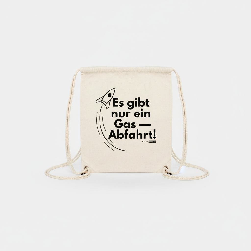 Dieses Design verbindet klare Typografie mit einem kraftvollen Raketen-Motiv und dem Statement „Es gibt nur ein Gas – Abfahrt!“.